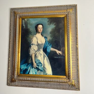 An Oleograph laid on canvas, of a young woman in a highly ornate gilt frame.